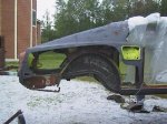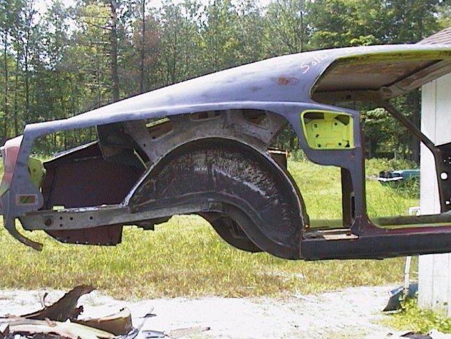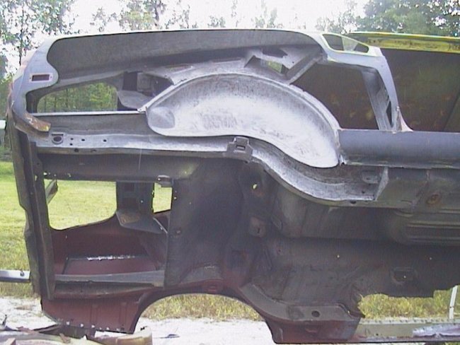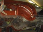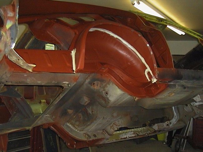 In this picture the remainder of the outer wheel well has been removed and lower trunk extension has been cut off. Prior to sandblasting the wheel well undercoating should be removed. Depending on how brittle it is, it can either be scraped off or a proprane torch can be used to soften it up first. There are a few chemical products on the market that can be used to soften it up. I've found that cheap lacquer thinner works pretty good if you wet down the undercoating and let it sit for a few moments.
