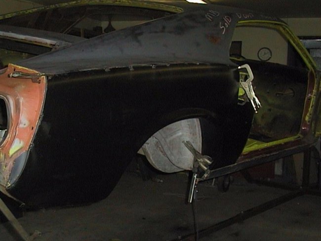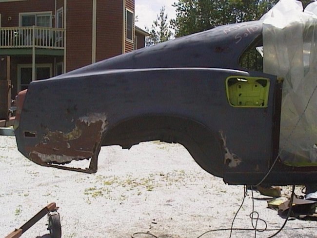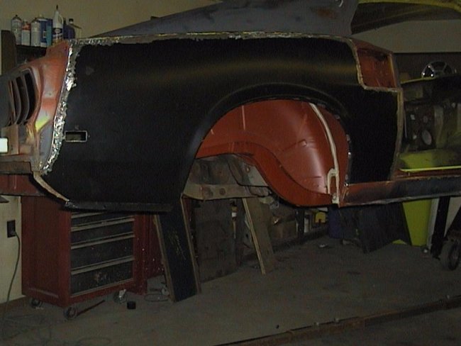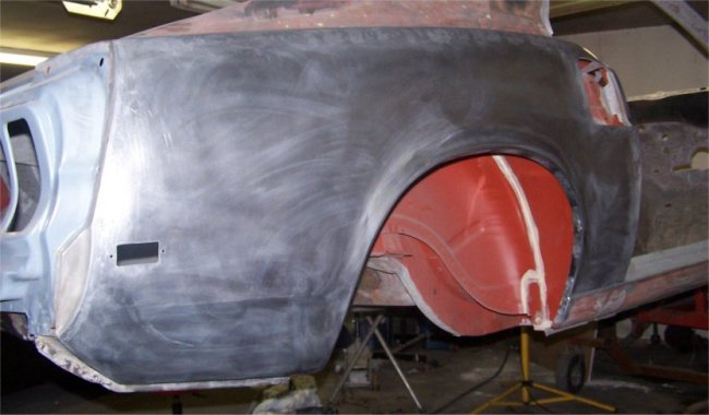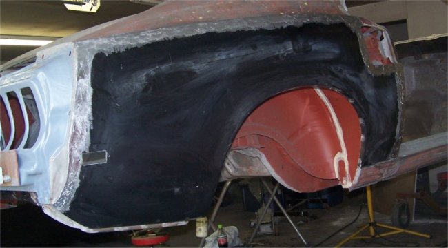 UPDATE (beginning 9/13/05): Once I completed work on the LH quarter I repeated the process with the Right side. Here the quarter has received a coat of lead over the entire butt-weld joint. I found that I used a lot less lead doing this side then the other.