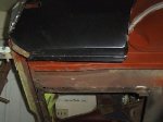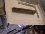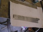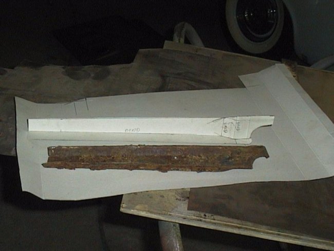 Before the repo quarter is trimmed at the bottom a new piece needs to be fabricated. This is done by first making a cardboard template. Luckily there was enough of the original piece left to use. In this picture you can see the original piece being used to make the template.