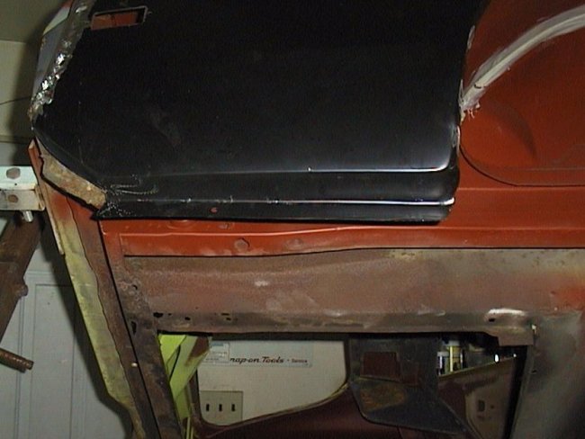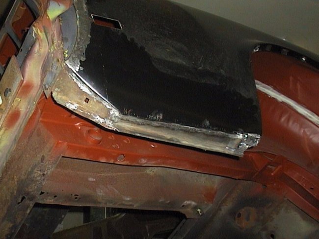 Then the new piece is butt-welded in place. It should be noted that the new piece drops below the lower drop-off by about a quarter of an inch. This extra 1/4 inch is bent back towards the inside of the car a little bit. This creates a little channel on the back that is filled with seam sealer. In this picture the welding has been completed and the welds have been ground down.