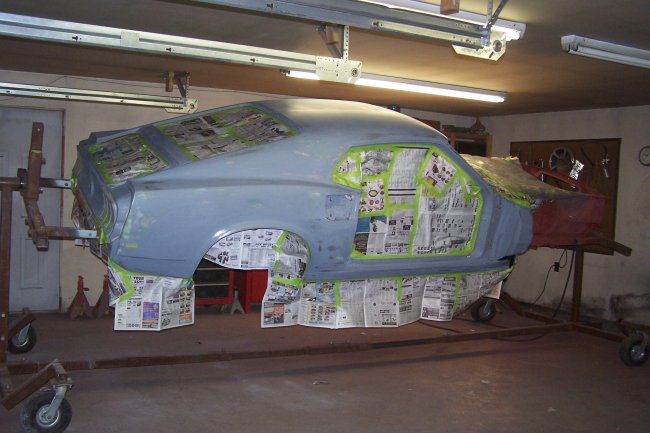 After allowng the epoxty primer to cure for a week, I only do the big jobs on the weekends anyways, I masked off the outside of the shell. The idea is to protect all areas on the outside of the car that will be painted body color later. The first step was to cover all openings with masking tape as seen here. The next step was to cover the rest with newspaper.