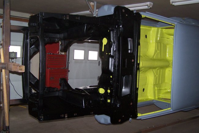 The next step in the process is to prime and paint the interior of the car body color, prime and paint the engine compartment semi-flat black and to prime the undercarriage. The undercarriage gets special detailing so that the original factory overspray is duplicated. This I did over a two day period. Please note that some of the following pictures are a little out of sequence. This was only done to show the areas of discussion.