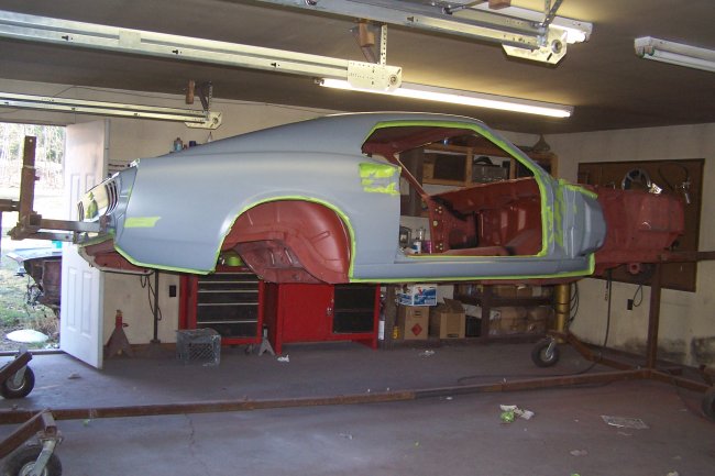 Here is shell after it has been block sanded and prepared for final primer. I blocked sanded the car with rigid rubber blocks and 220 grit paper, wet. Some areas had to be reprimed and blocked. The first coat of epoxy primer was allowed to cure for a month prior to block sanding. The epoxy primer I used for the touched up areas was allowed to cure for a week. The final coat of epoxy primer was reduced 4:1:1.