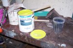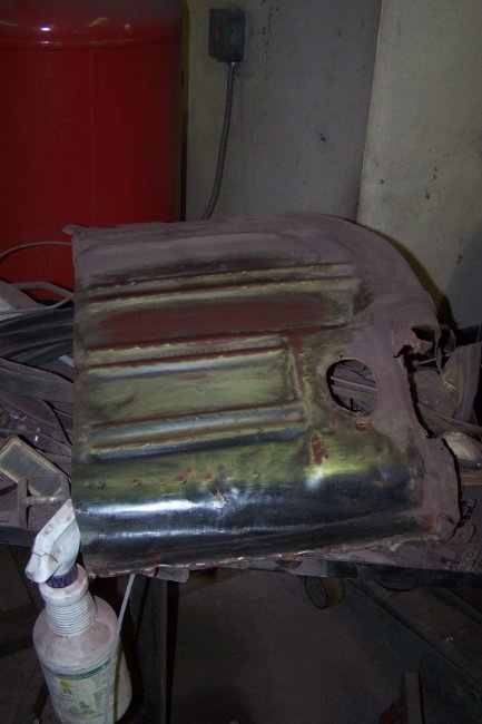 The primer used by Ford is actually a mixture of primer and waste paint from the previous vehicles that came down the line. So its not too unusual to see strange colored primer. In my case the color was a browninsh red. Having kept a piece of the old floorpan, I tinted some red epoxy primer with black to get a shade that matched the floorpan. Once mixed I sprayed the entire interior, undercarriage and engine compartment all at the same time.