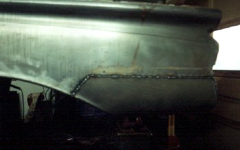 With the repair panel temporarily screwed in place I was able to make cardboard templates to aid in the fabrication of new lower extension pieces. Here you can see them mig welded in place.