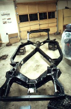 Here's the frame after a dozen bags of sandblasting fun. And then after 3 quarts of chassis black paint.