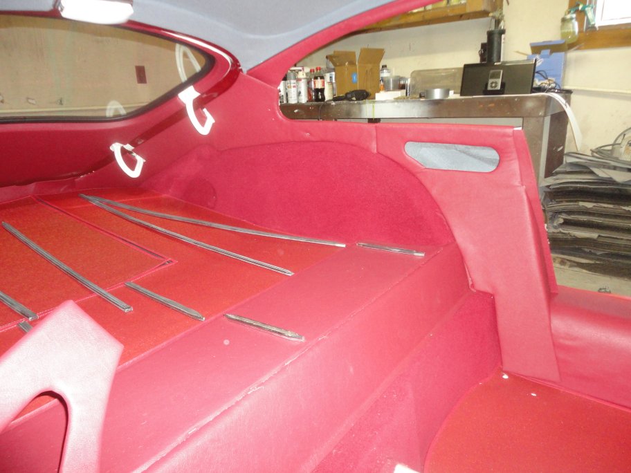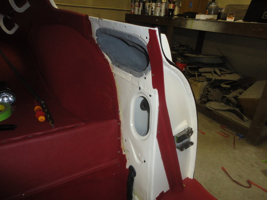 44) The rear side trim goes in next. These panels have little clips that hook from the back side, like door panels. All one has to do is line up the clips with the holes in the body and pound them in by hand. Since the suppier that I used did not do a very good job of making the panels, I had to take them apart and reglue them so that there were no wrinkles. I took me several attemps to get it right. I also had to make the holes for the seat belt mounting bolt and the quarter window latches.