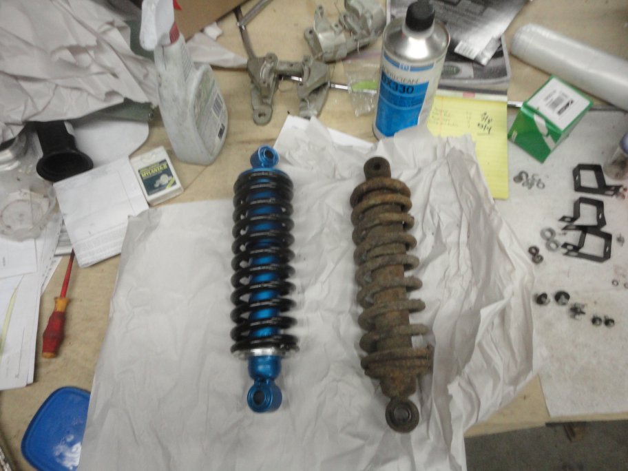 1) For the rear shocks there is no point in saving any of the original components unless they are in really nice shape. Every piece can be bought new. All you have to do is put them together. Original Girling brand shocks are not available, but the Boge aftermarket shocks are really close in appearance. If you cannot save the original dust shields from the original shocks, repos are available.
