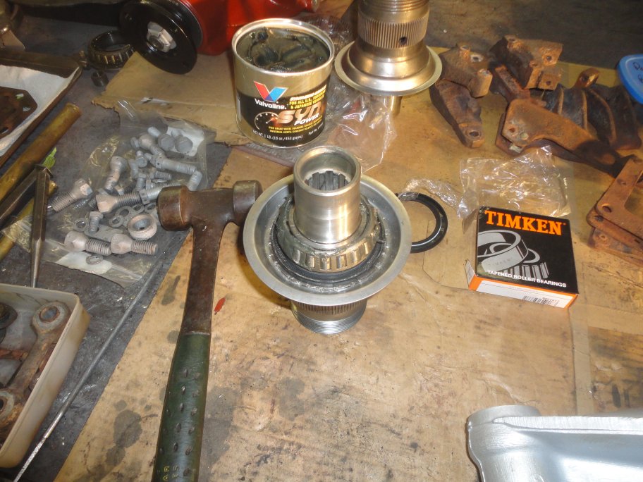 I used a large socket and a hammer to drive the inner bearing onto the end of the hub assembly (though I could have used a driveshaft yoke and drawn it in). I drove it on enough to produce roughly 0.020" worth of bearing float. (too little and I would have had to press the bearings back out and start over). It should be noted the end of the inner hub is actually too short to go all the way through the bearing. It is in fact roughly 0.150" too short.